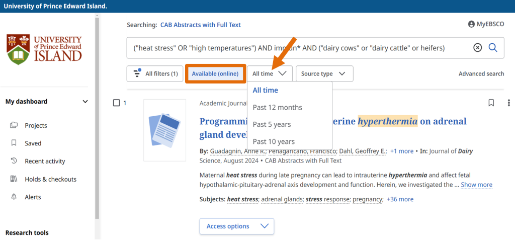 For example, I can choose only the results that are Available (online) in full text. Under the “All time” button, I can choose to only see results from the past 12 months, 5 years, or 10 years,