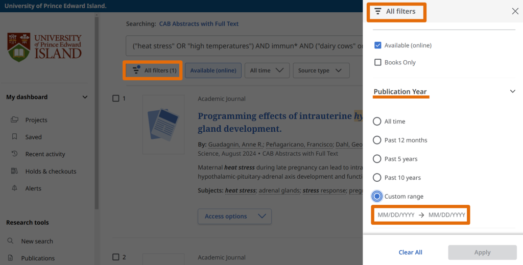 but I can also use the “All filters” button to open the filters window and set a more specific time period in the “Publication Date” section.