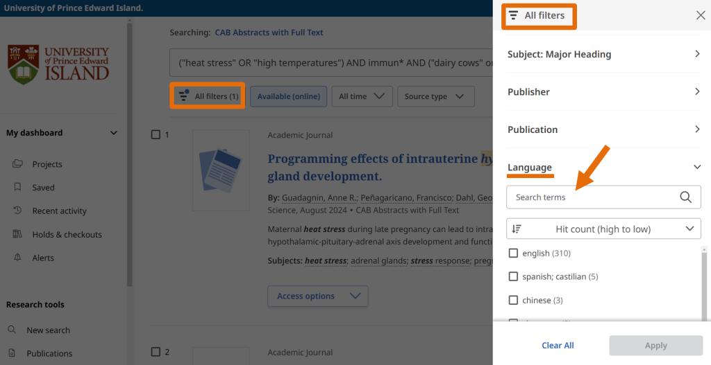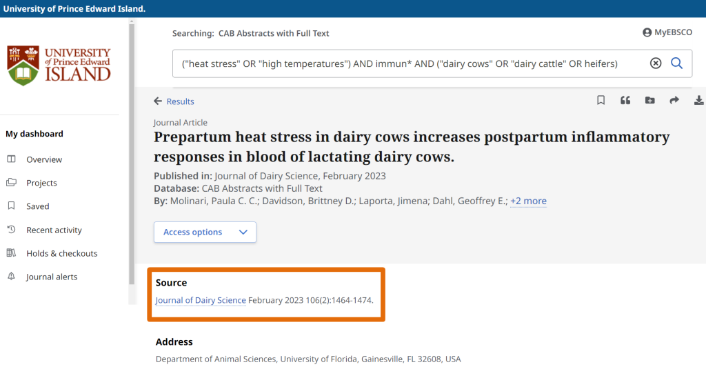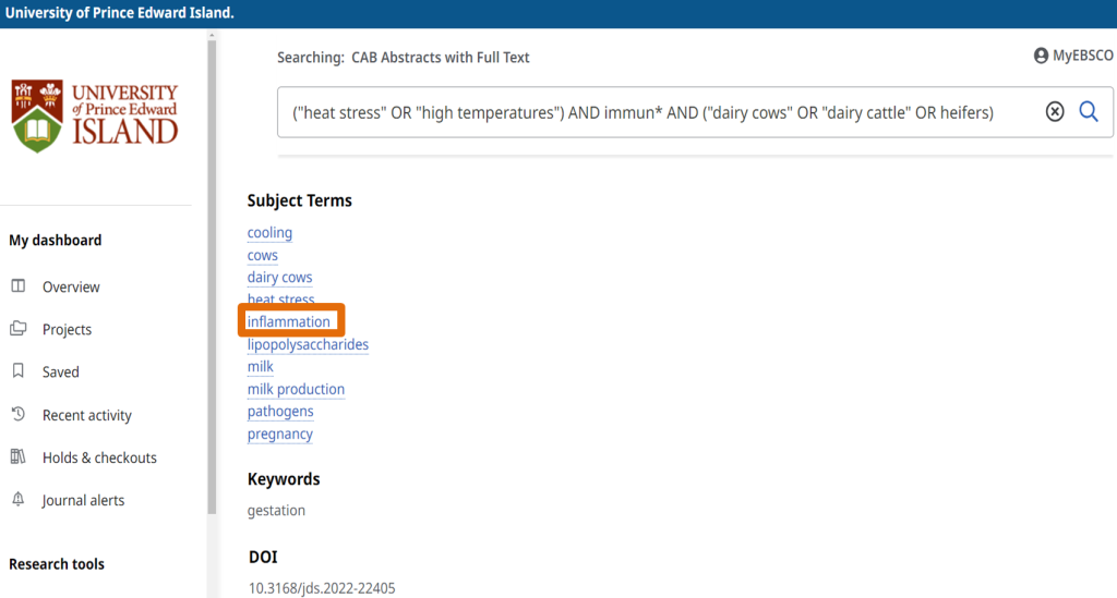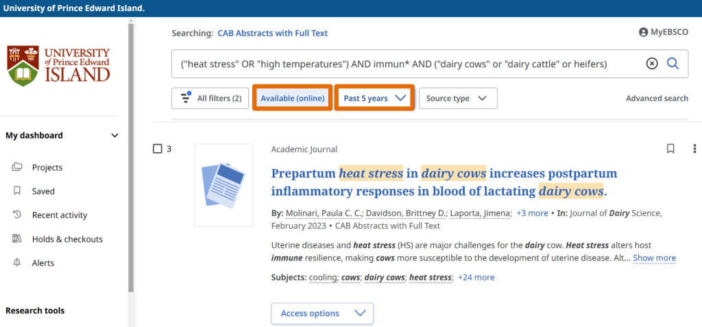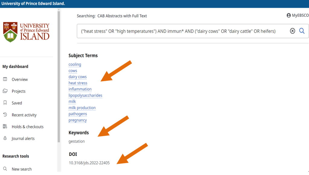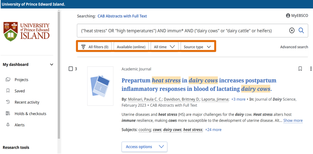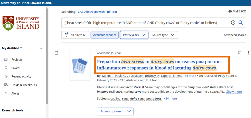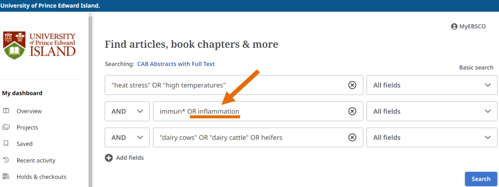 Before I search, I’ll take a minute to think about other words that researchers might use to describe the same concept. For “heat stress,” I might also want to see articles about times of high temperature, so I’ll add OR “high temperatures” to the first box. Using OR tells the database that I want any results that use either the phrase “heat stress” OR the phrase “high temperatures.” For “immune system,” I’d also be interested in “immune function,” “immunity,” and other terms starting with “immun.” I can use immun* to find any term starting with those five letters. Dairy cows might also be called dairy cattle or heifers.