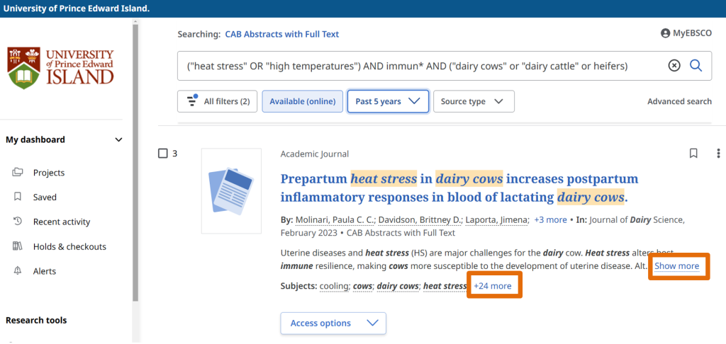 If I want to know more about a specific search result, the “show more” and “plus more” links show me more of the abstract and all of the subject terms.