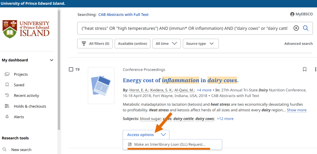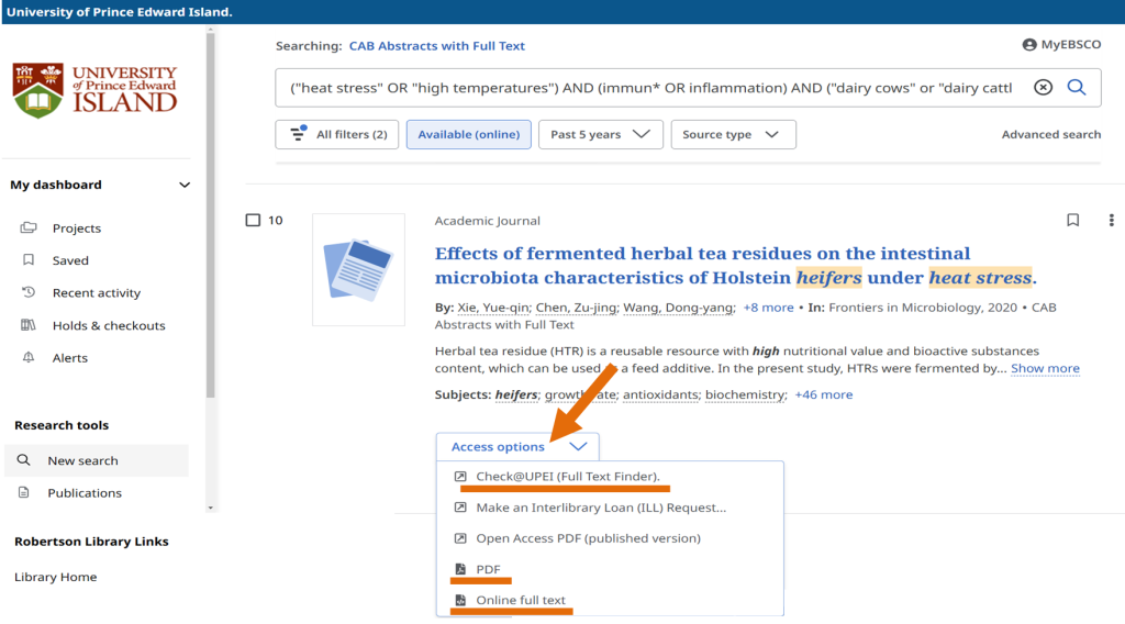 On the search results and the item page, each item has a dropdown menu labeled “Access options.” In the Access Options dropdown, the Check@UPEI (Full Text Finder) link should take me to the full text of this article. The same applies to PDF or an “Online full text” link. The PDF and “Online full text” links will open in the current tab, while other links will open in a new tab or window.
