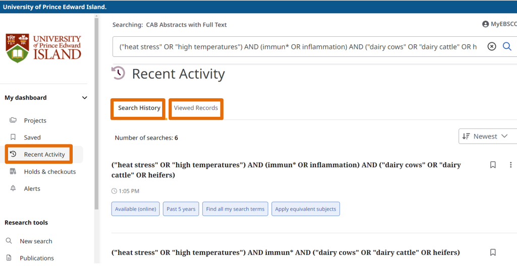 If I want to see an article that I clicked on earlier, I can use the “Recent Activity” section in the menu on the left side of the page. On this page, there are two sections: Search History and Viewed Records. Search History is a list of all the searches I’ve run in this session, with the option to run them again by clicking on the search terms. The “Viewed Records” list shows the item records I’ve opened during this session.