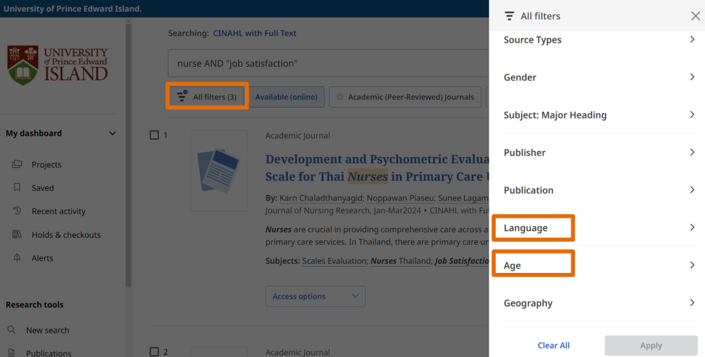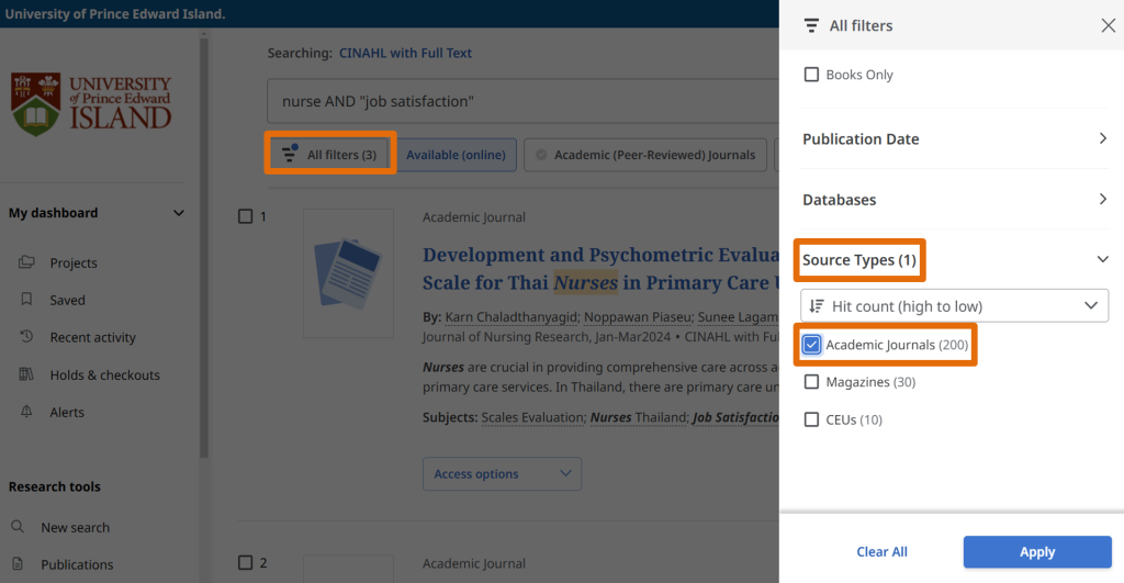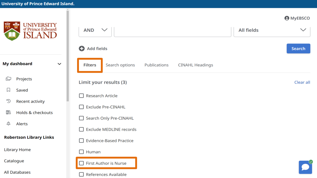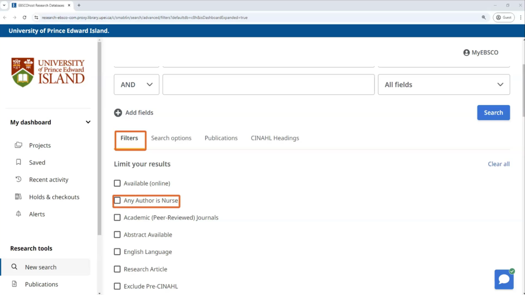 There are many useful filters in CINAHL that can help me find the information I need. To start, I’m going to select the filter for sources where Any Author is a Nurse.