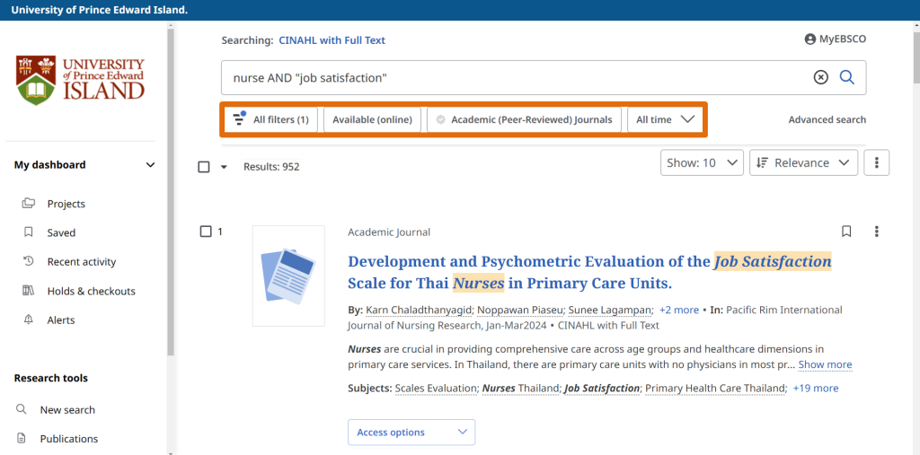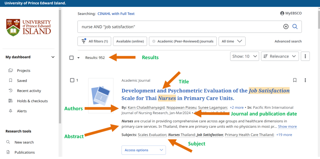 After I select “Search,” I see 952 results. I can see the title of each result, the list of subject terms related to the result, the journal and publication date, the authors, and the very beginning of the abstract.