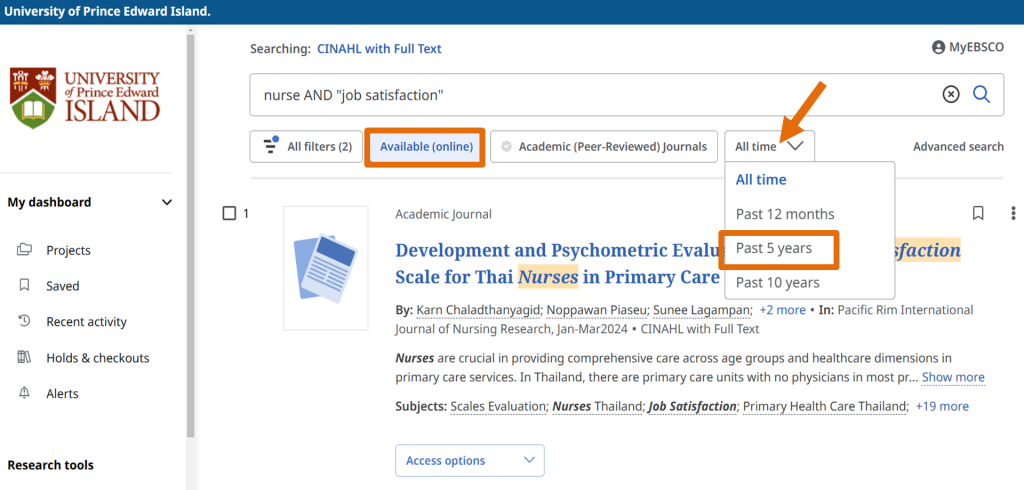 For example, I can choose only the results that are Available (online) in full text. Under the “All time” button, I can choose to only see results from the past 12 months, 5 years, or 10 years. I’ll choose the past 5 years.