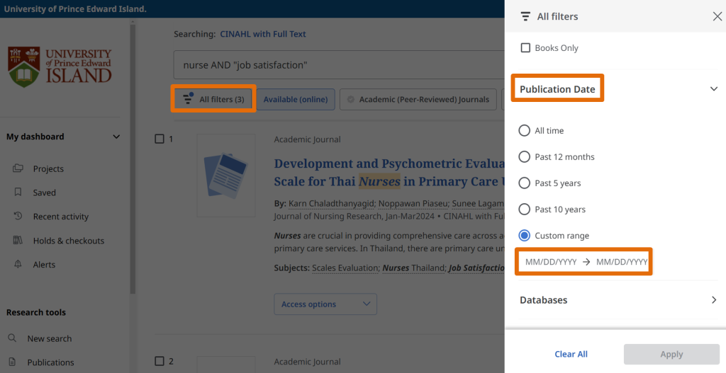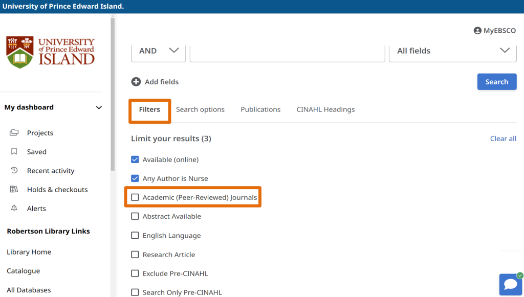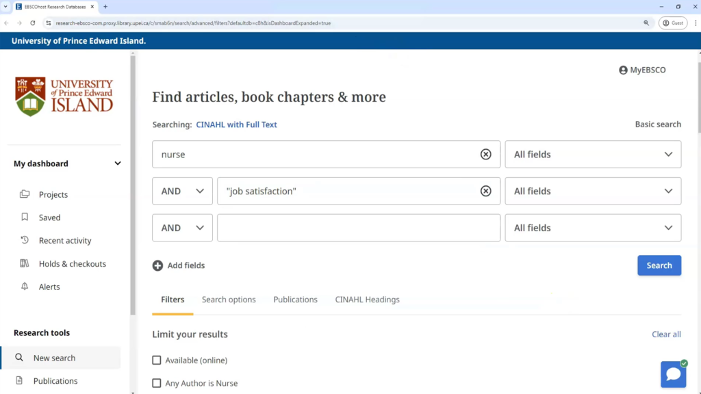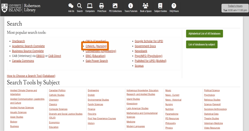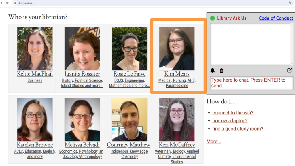 If you need more help, AskUs at the service desk, phone us at (902)-566-0583, send an email to reference@upei.ca, or use the chat tool on the library website. You can also find the nursing librarian’s information on the library homepage.