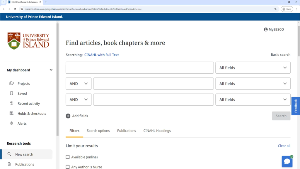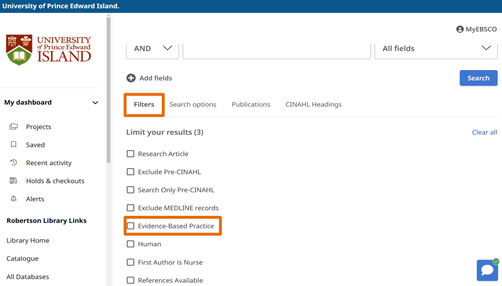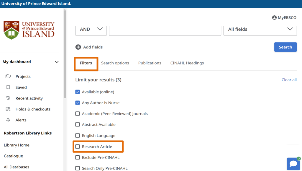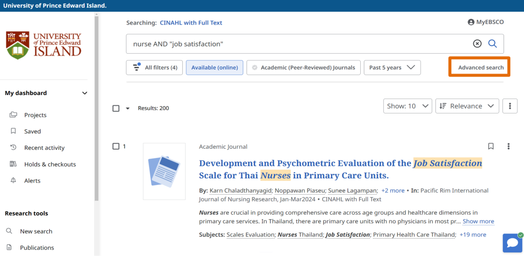 However, there are some filters in CINAHL that are only available on the Advanced Search page. I can get back there using the “Advanced Search” link under the search box.