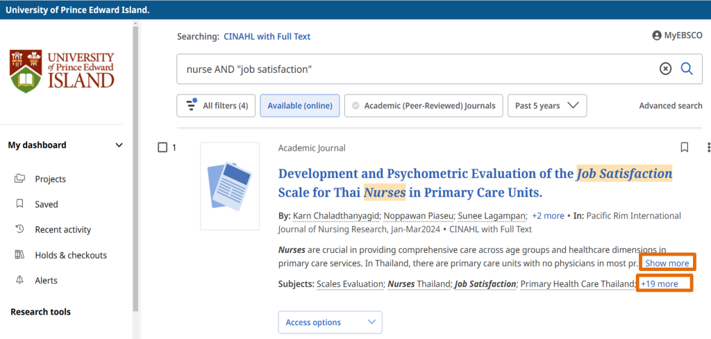 If I want to know more about a specific search result, the “show more” and “plus more” links show me more of the abstract and all of the subject terms.
