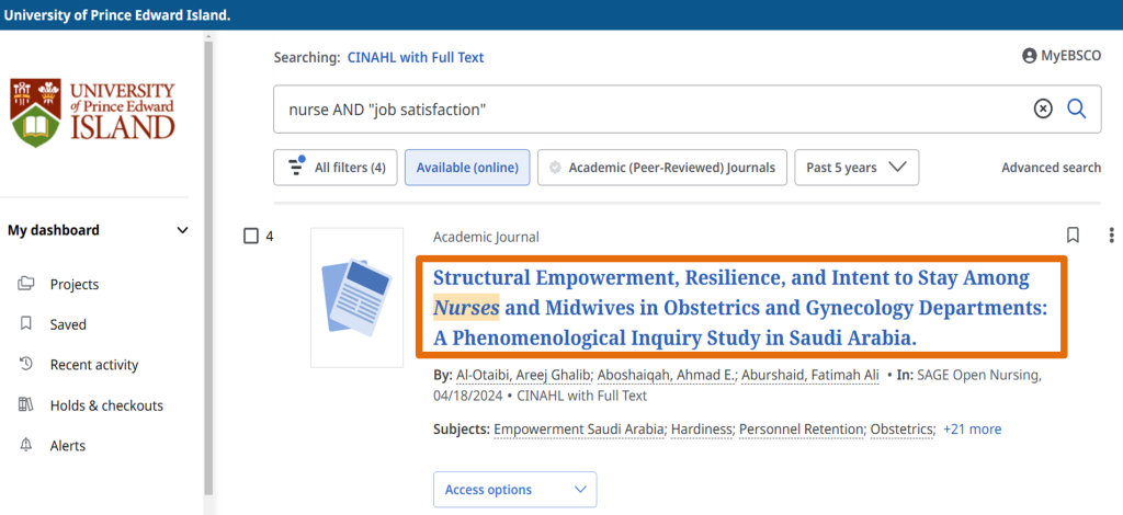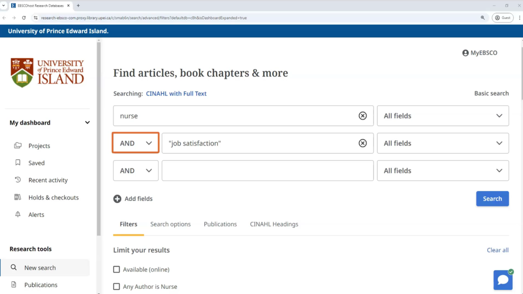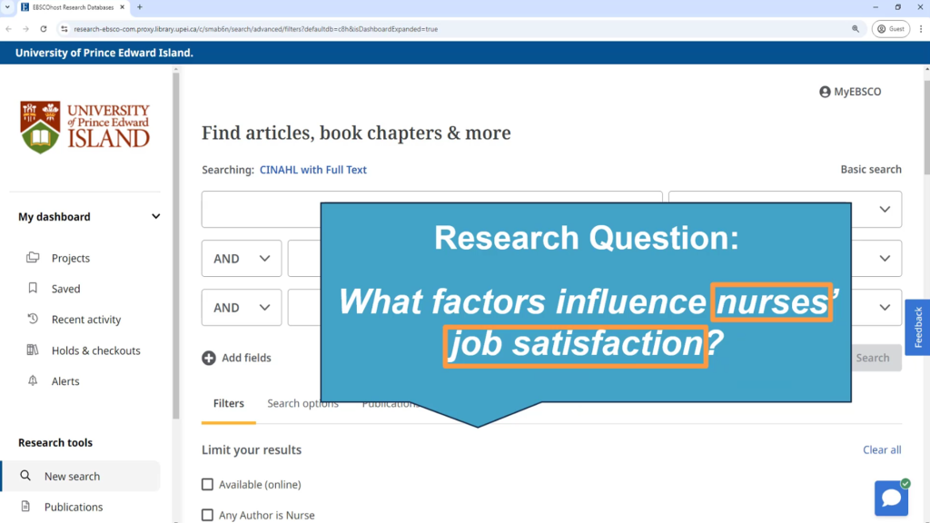 In CINAHL, we need to search for keywords or concepts, not a whole question. Our question has two important concepts: nurses and job satisfaction. Words like “factors,” “influence,” “effect,” and “relationship” are not necessary to include as search terms since they appear in articles on almost any topic. By searching for both “nurses” and “job satisfaction,” we’re already looking for articles about the relationship between those two concepts.