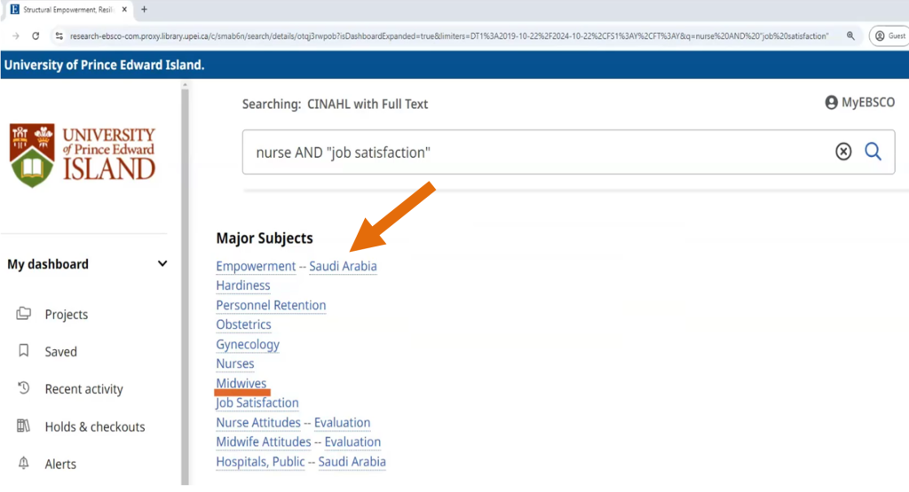 The subject terms are a good place to look for other search term ideas. For example, if I am also interested in articles about job satisfaction among midwives and nurse midwives,