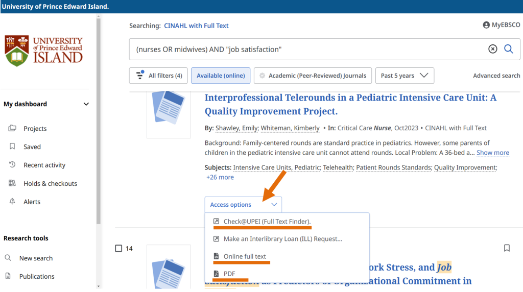 On the search results and the item page, each item has a dropdown menu labeled “Access options.” In the Access Options dropdown, the Check@UPEI (Full Text Finder) link should take me to the full text of this article. The same applies to PDF or an “Online full text” link. The PDF and “Online full text” links will open in the current tab, while other links will open in a new tab or window.