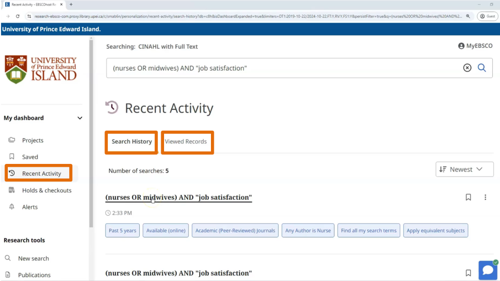 If I want to see an article that I clicked on earlier, I can use the “Recent Activity” section in the menu on the left side of the page. On this page, there are two sections: Search History and Viewed Records. Search History is a list of all the searches I’ve run in this session, with the option to run them again by clicking on the search terms. The “Viewed Records” list shows the item records I’ve opened during this session.
