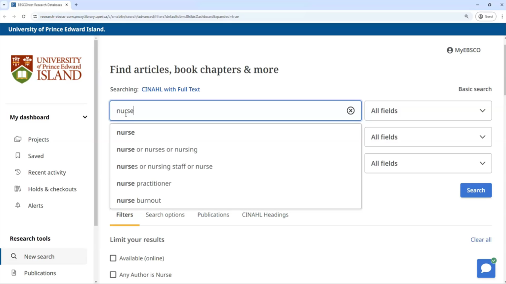 I am going to use each row of the search box for each concept in my topic. I will put the first keyword, nurse, into the top search box. As I begin typing the word “nurse” into the search box, some suggested search terms appear under the search box. This is a helpful feature of CINAHL, and I can use these if the suggested search terms are relevant.