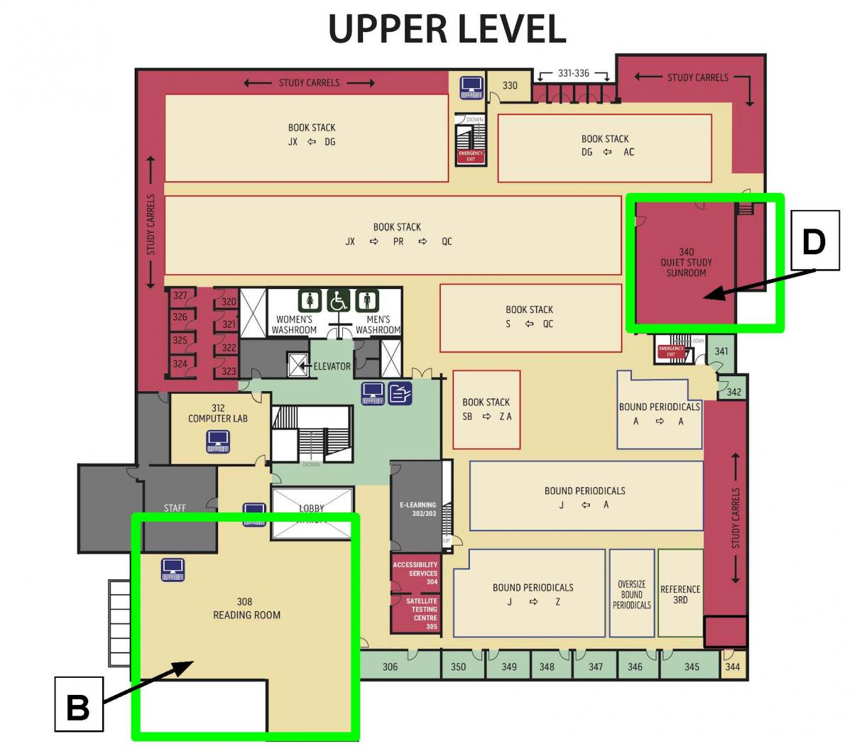 - take the hallway to your right, past the Accessibility Testing Centre, to access the Reading Room that is directly above the breezeway, or the study areas along the South-west walls of the Stacks. (did you make your online study area reservation?)
