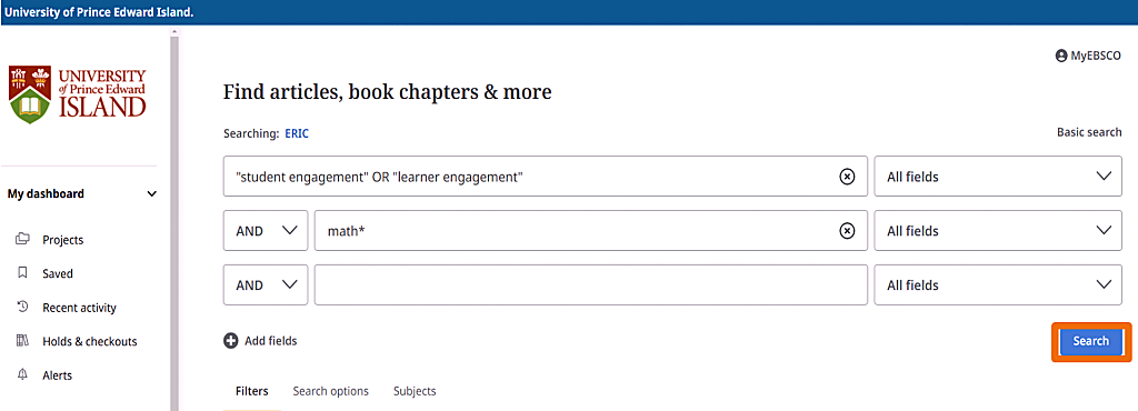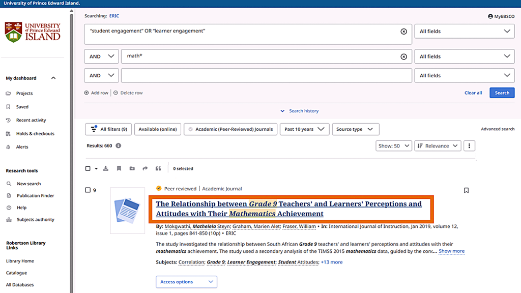 As an example, I’ll search for information about strategies to increase student engagement in math classes. ERIC uses a keyword-based search, so I only want to search for the most important words in my topic. In this case, there are two main parts to my topic: student engagement and math classes.