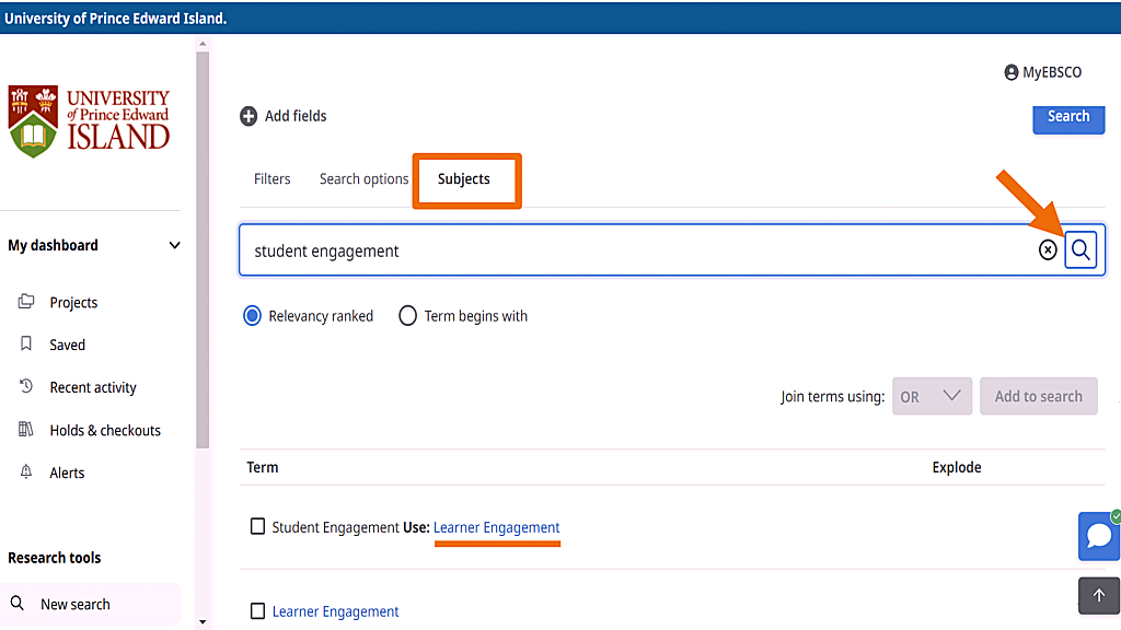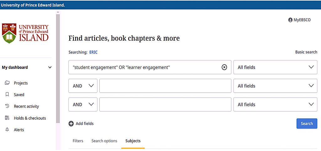 So I’ll add “learner engagement” as a search term. Searching for “student engagement” OR “learner engagement” will help me find any articles that use “student engagement” in places like the title or abstract, while also including articles that have “learner engagement” in their standardized subject terms.