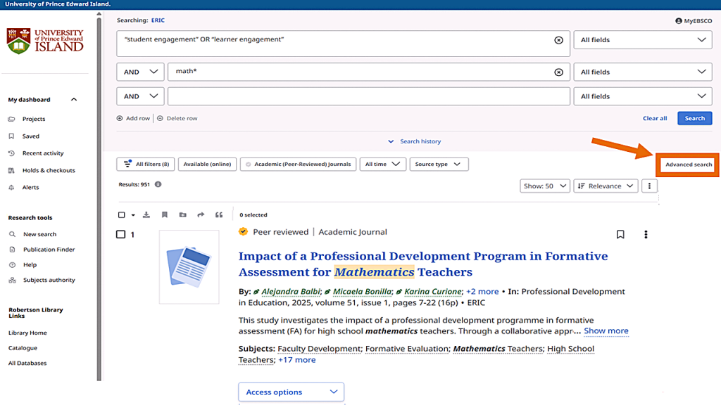To access ERIC-specific filters such as Education Level, I can click “Advanced Search” to get back to the original Advanced Search page.
