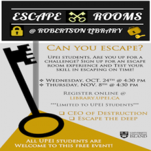 Escape Rooms are limited to UPEI students. The maximum size for a group in each room is six participants.