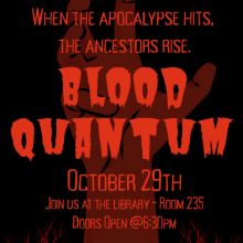 Bring your cozy blankets and join the Indigenous Student Society, the Mawi'omi Centre, and Robertson Library for a Halloween thriller: Blood Quantum — a thrilling Indigenous take on survival, resistance, and what it means to protect your people. Wednesday, October 29th at 7:00 PM, RL 235. Doors open 6:30. All UPEI students, faculty, and staff are welcome.