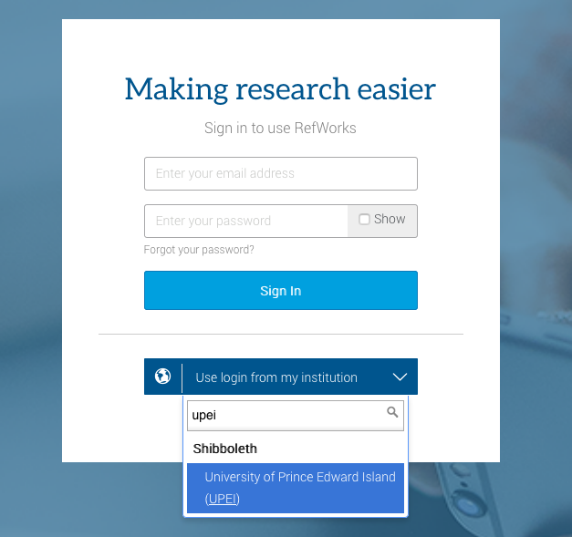 It is now possible to log in to Refworks using your UPEI username and password. Select "University of Prince Edward Island (UPEI)" from the "Use login from my institution" drop-down, and log in as usual. If you don't have an account associated with your UPEI email address yet, this will allow you to create one.