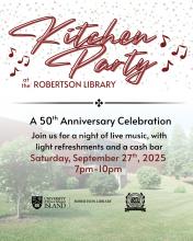 Come make some noise in the library! Join us for our 50th anniversary Kitchen Party this Saturday (Sept 27th) from 7-10 pm! There will be live music, light refreshments, and a cash bar. All are welcome! Community Events Library Event News