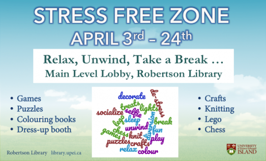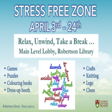 Back by popular demand, the Robertson Library is hosting the Stress Free Zone! Step into the Zone to relax and have some fun.